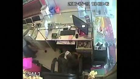 Câmeras de segurança registraram o momento em que um macaco dá uma de malandro e rouba dinheiro da caixa registradora de uma joalheria na Índia.